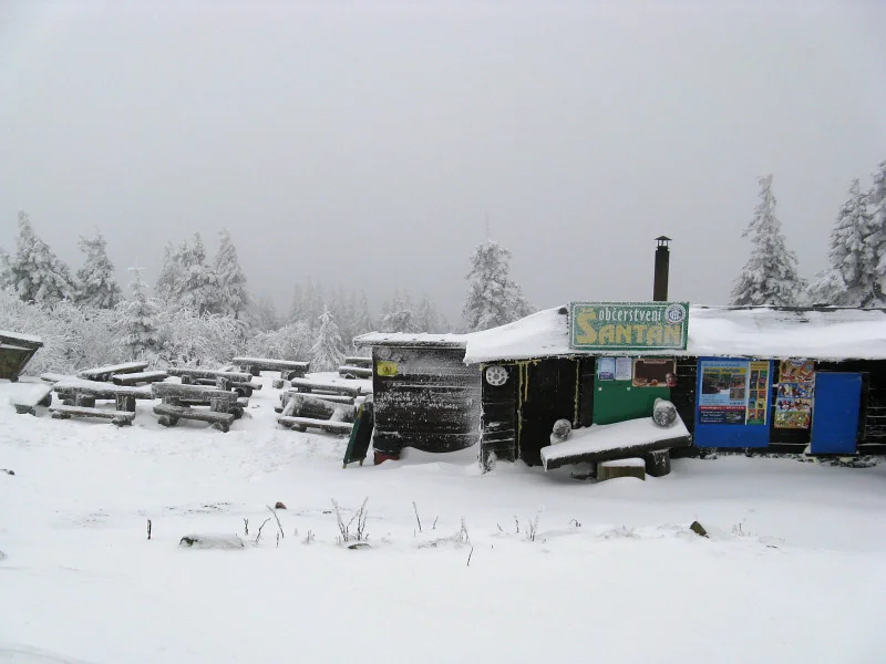 Šantán právě obsahuje: tři konzumenty, milou paní za pultem a říznou česnečku