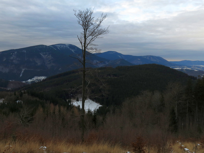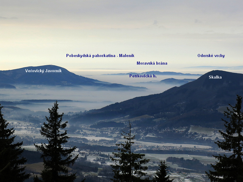 Vlevo Kľak. Vpravo postupně sjezdovky Bílá a Makov. A Manínska tiesňava
