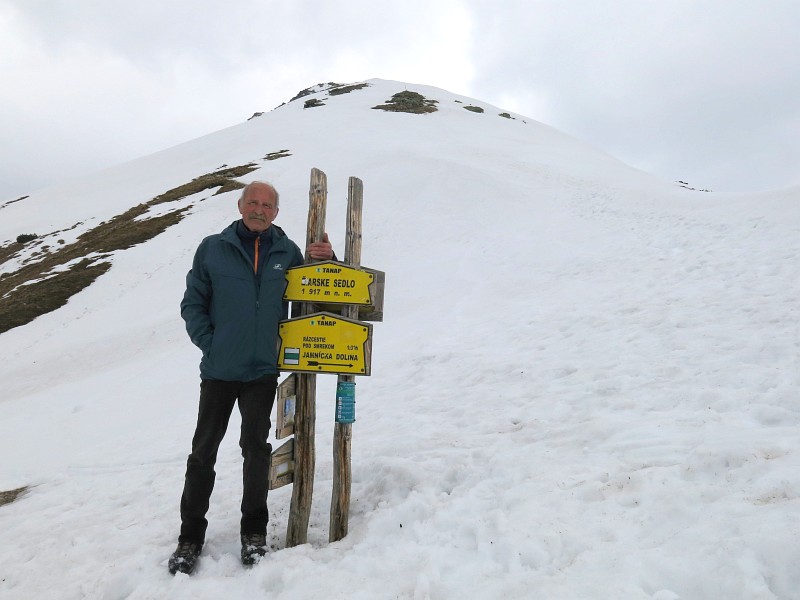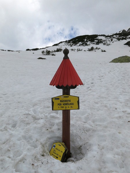 Rozcestí Pod Homôlkou. Směrovka Žiarska chata nabízí cestu kolem světa