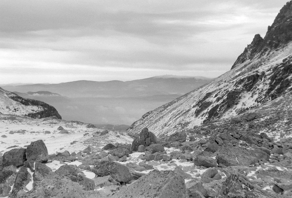 Uprostřed Slavkovské sedlo, vpravo v mraku Slavkovská kopa a Slavkovský štít