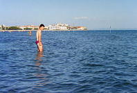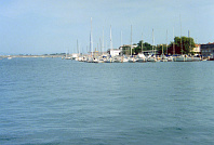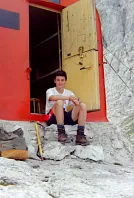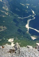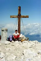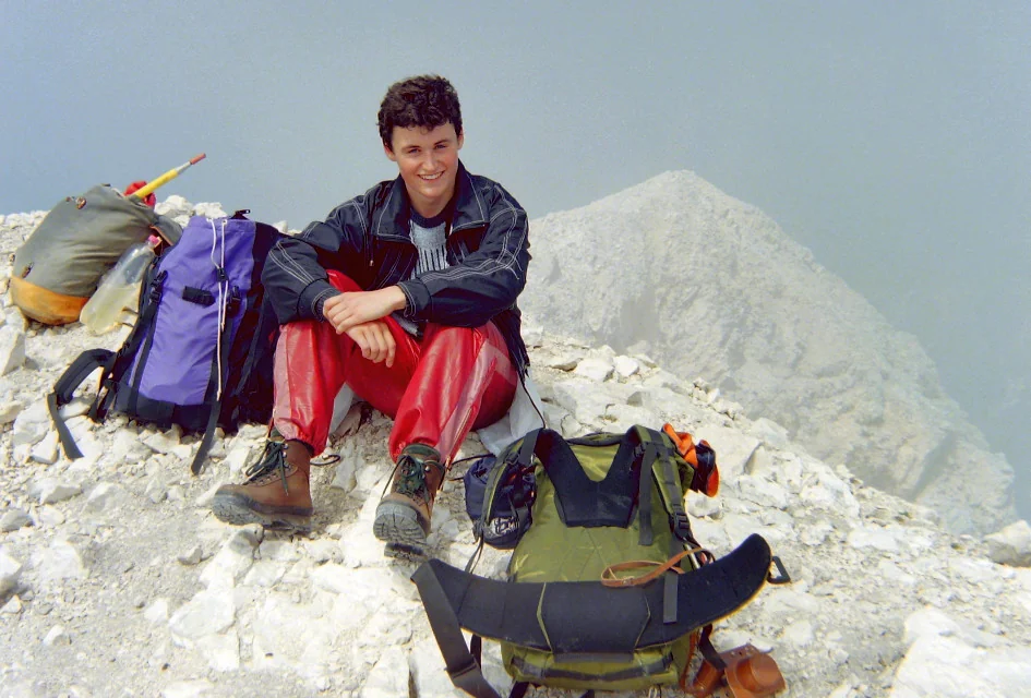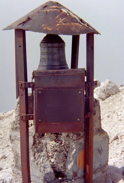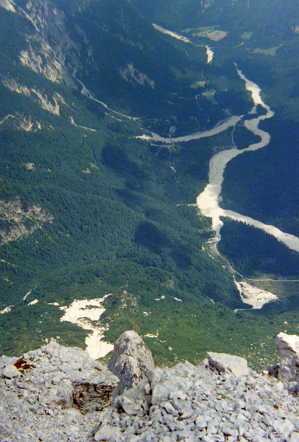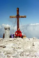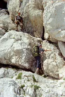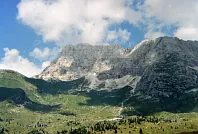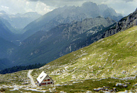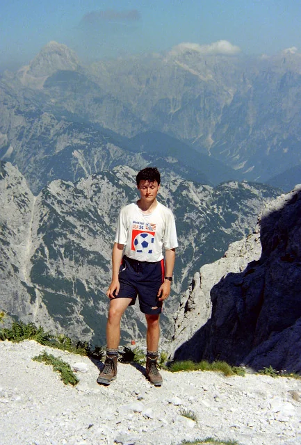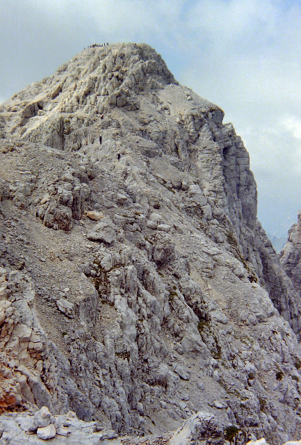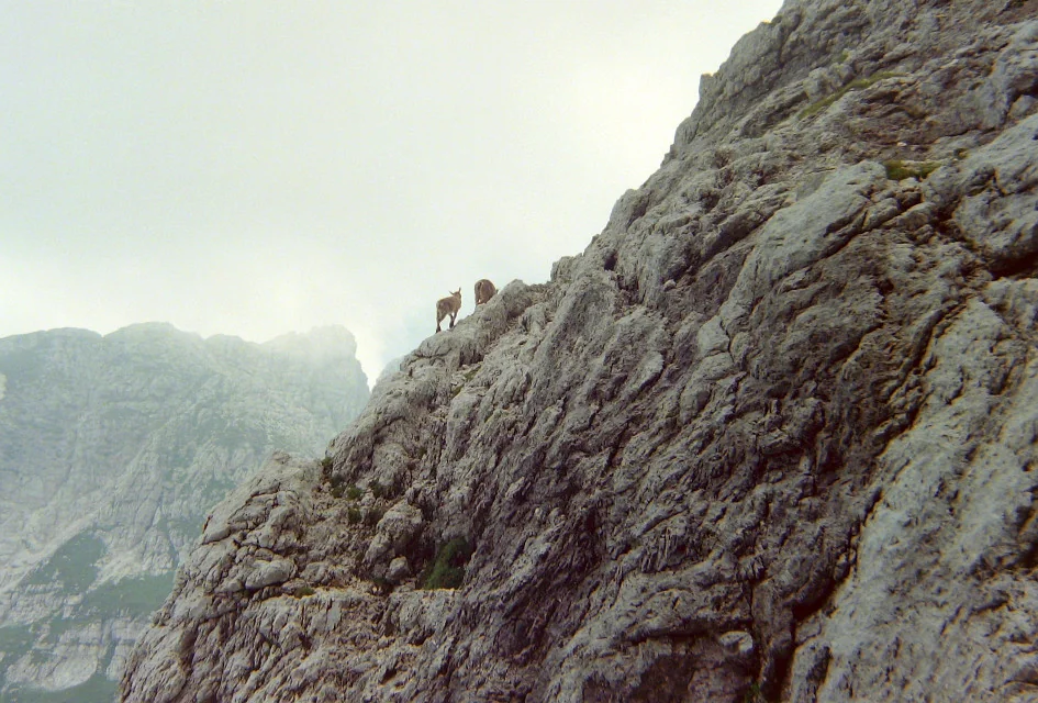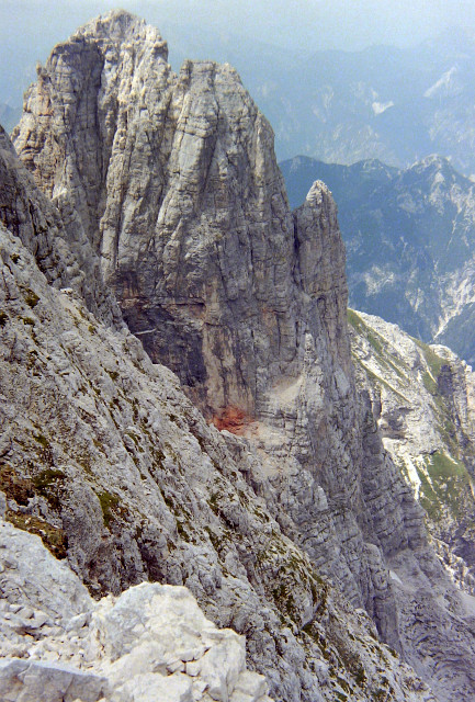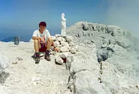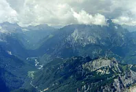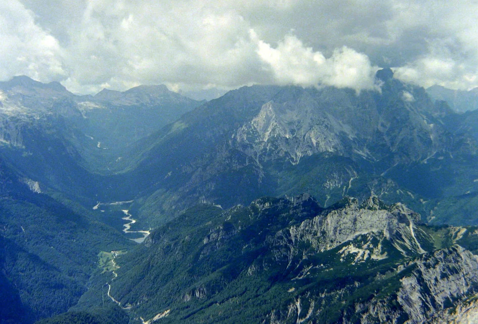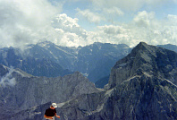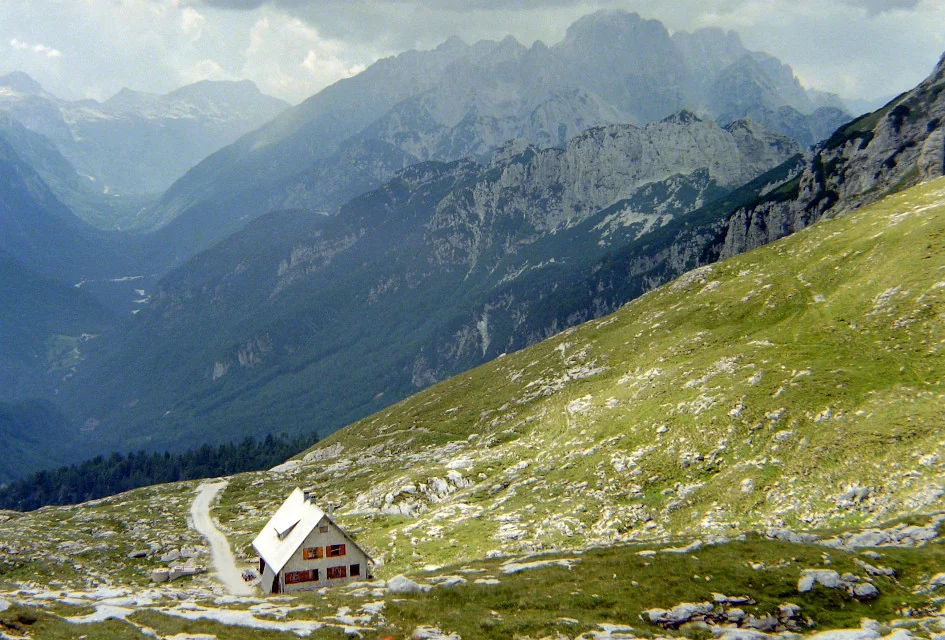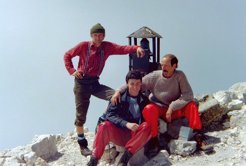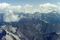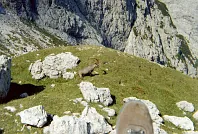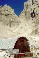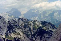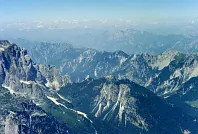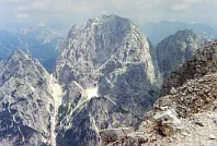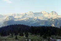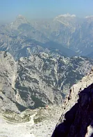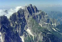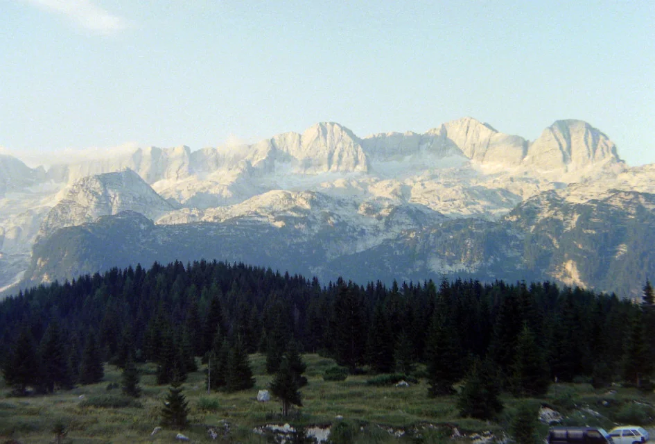 Ráno na Altipiano del Montasio. Vlevo Prestreljenik, druhý zprava Monte Canin