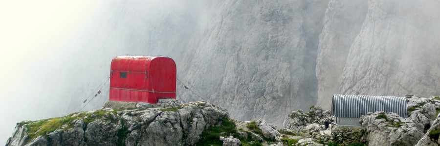Suringar (2430 m). Déšť slábne, docházíme do dřevěného bivaku Stuparich, který je spíš malou