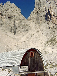 Gorizia a Ricovero Riobianco (1950 m). Biv.Gorizia stojí na skalním ostrohu prahu kotle pod sedlem Forc.del Vallone,