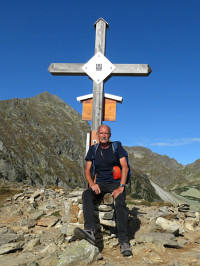 za účelem fotografování zrcadlení hor. Další odbočení některé z nás přivádí na vyhlídkový Hauseck. U jeho kříže jsme v 9:45. Za dalších 50 minut už jsme v sedle 2150 m, z nějž pokračuje výstup