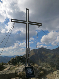 Předvrcholové skalní partie mají ryze vysokohorský ráz. Ke kříži na Gr. Bösenstein docházíme v 11:40, 13. září 2018. Výborná to "Beobachtungsstelle" okolních horských monumentů.
