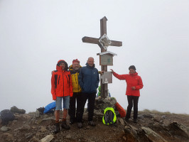Vytrvalý déšť urychluje naše kroky. Po 30minutách, 2. září 2019, v 10:35, stojíme u vrcholového kříže. Na rozdíl od loňského roku poskytuje vyhlídkový Hauseck prakticky nulovou dohlednost.