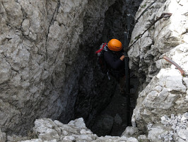 Sestup překvapil snadností, ani převislý žebřík nezazlobil. Pod stěnou s železnými stupy si dopřáváme poslední pauzu a dopíjíme zbytky "vrcholovky". Na terasu chaty vstupujeme o půl šesté. Spokojenost s výstupem zajímavým terénem a za krásného počasí se dostavuje u všech účastníků. Teď už jen napravit pitný režim, najít volný stůl a věnovat se večerním kartám. Zítra nás čeká cesta k autu, 60 km přejezdu do Maria Alm am Steinernen Meer - Parkplatz Sandten.