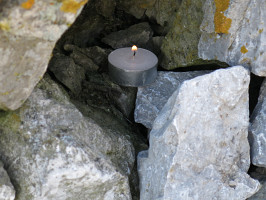 Sestupujeme o dva metry níže, do sedélka, které jsme těsně pod vrcholem míjeli. Tady budeme mít klid pro uctění památky našeho milého kamaráda a vynikajícího horala Ladi Vávry († 19. 8. 2013). Hana vkládá zapálenou svíčku do závětrného výklenku mezi kameny, smutná to chvíle. Nuž příteli, budeš s námi na všech kopcích, které nám ještě život dopřeje. Věřme, že Ti to po nebeských horách dobře šlape.