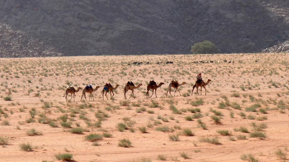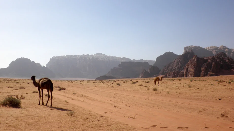 Skály Wadi Rum a velbloudi