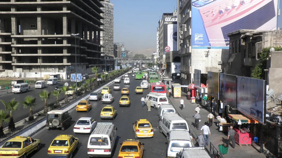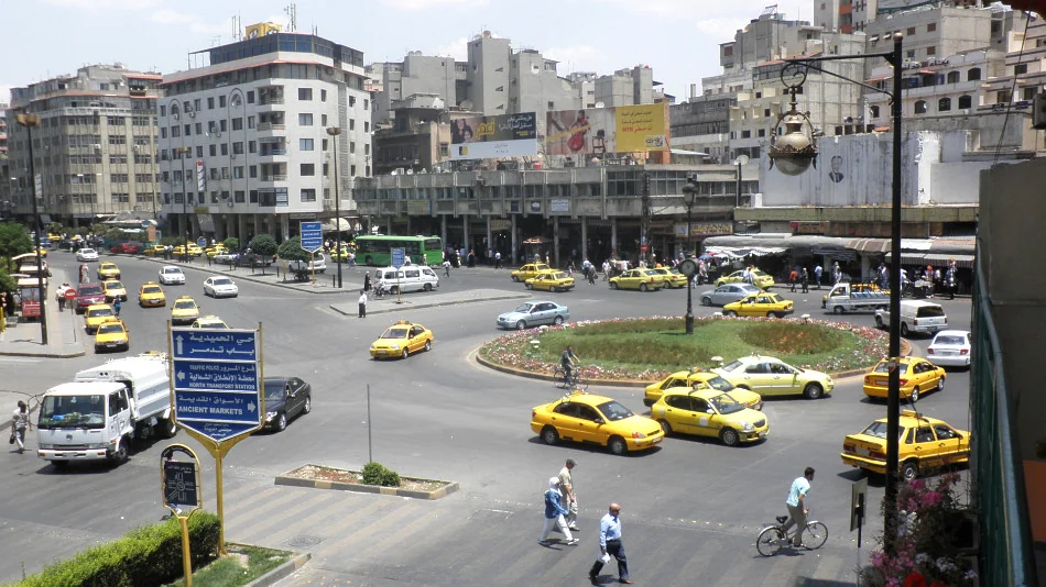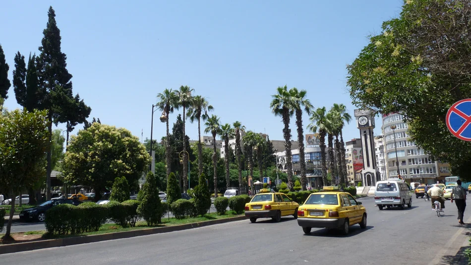 Rušná Shoukry al-Qouwatry. Vlevo vykukuje Damascus Tower