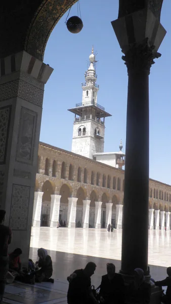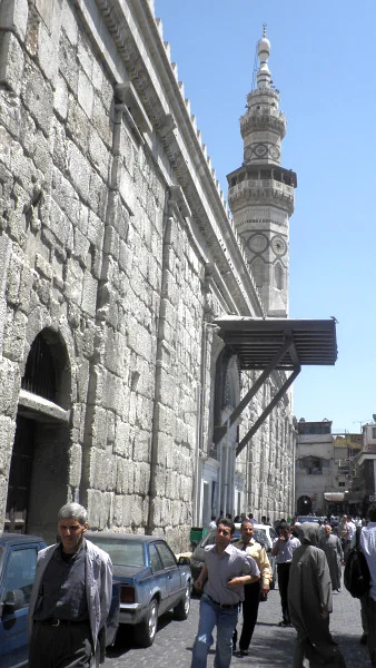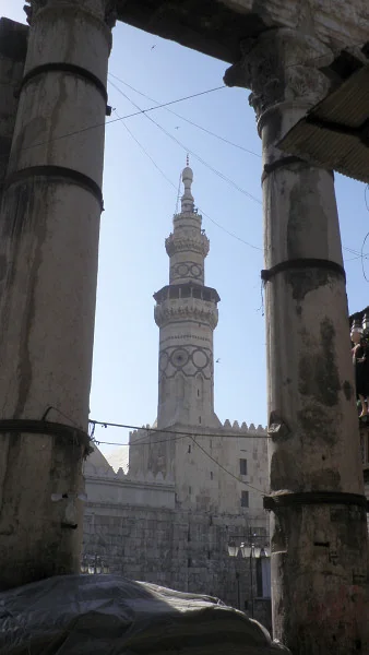 Palác sousedí s Umayyovskou mešitou. Viz její třetí minaret Issa