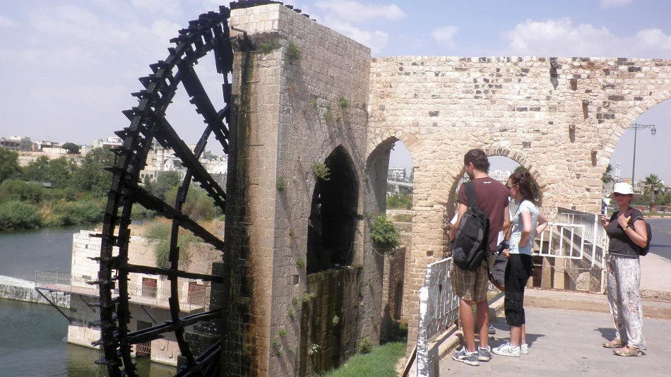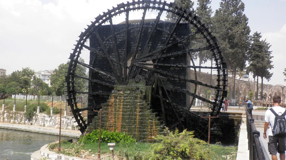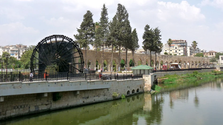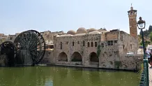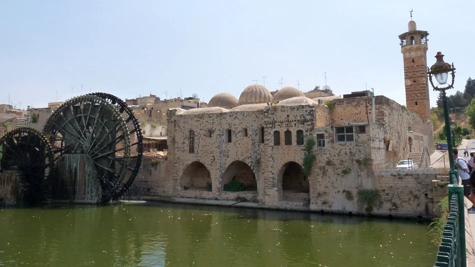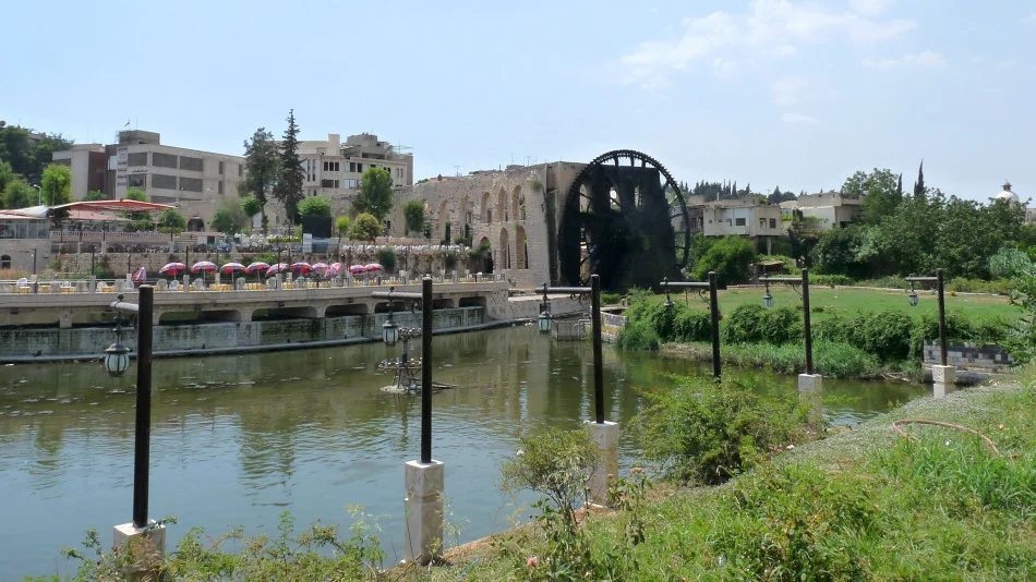 Mešita al-Nouri / Nur al-Din vyrůstá z řeky Orontes a má své norie