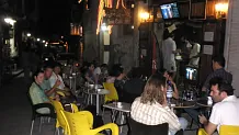 Plná pouliční kavárna, v TV běží fotbalové MS
