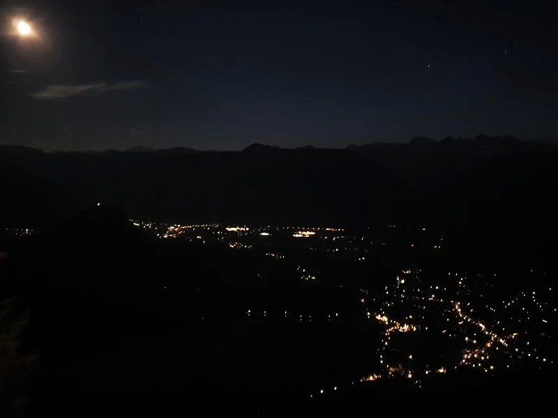 Altausseer See, světla Altaussee a měsíc. Vpravo na obzoru noční Dachstein