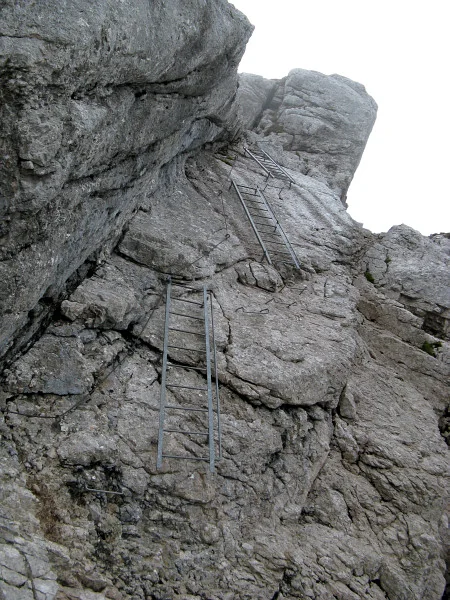Lomený žebřík. Nutno se jistit na něm, ne na laně