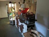 Barpult v kravské kůži a pyramida z hrnků