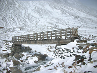 Lávka přes Vernagtbach vrhá stín, po třech dnech se ukazuje slunce