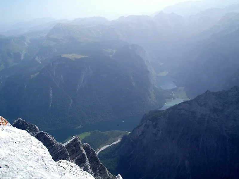 Königssee a Obersee hluboko pod námi. Hluboko = 2100 metrů