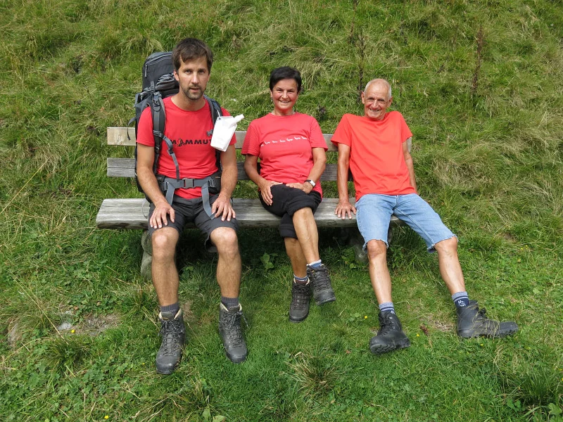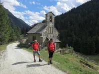 Kostelík nad Muritzenalm. Všichni ještě s batohy na zádech