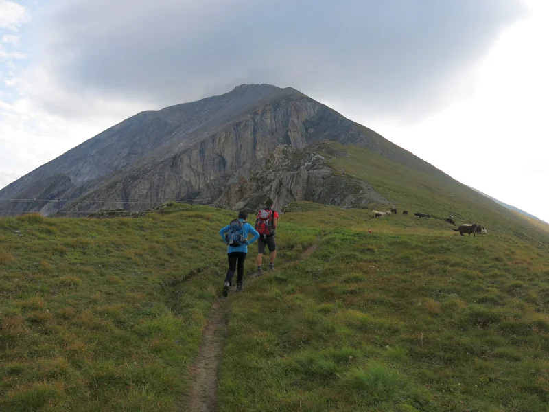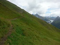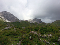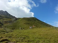 Pokračujeme k Riedingscharte. Vlevo nahoře malé stádo ovcí