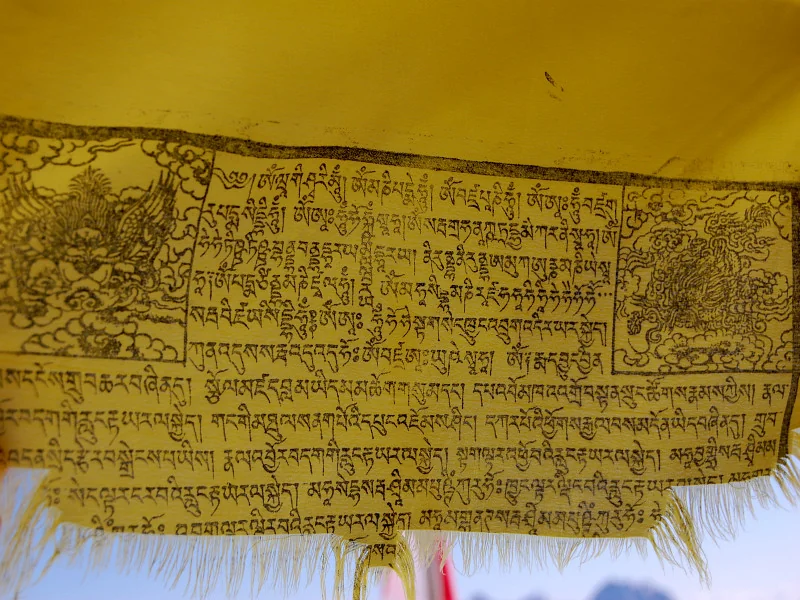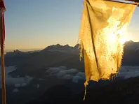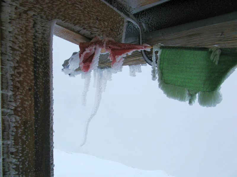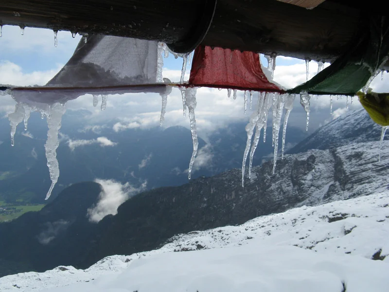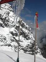 Neradostný ranní pohled na zmrzlé modlitební praporky a rampouchy