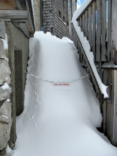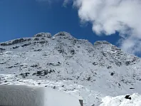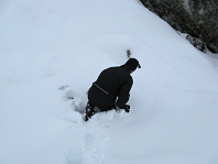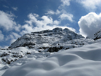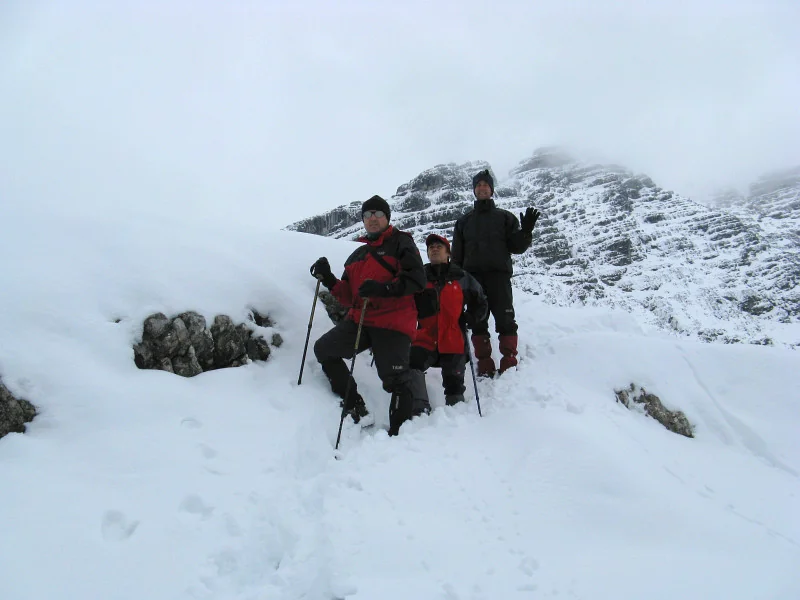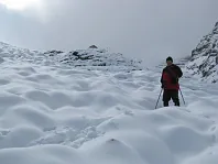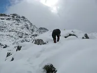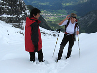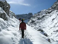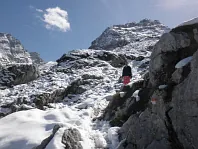 V hlubokém sněhu výstup do sedla Wehrgrubenjoch nezvládneme, ...