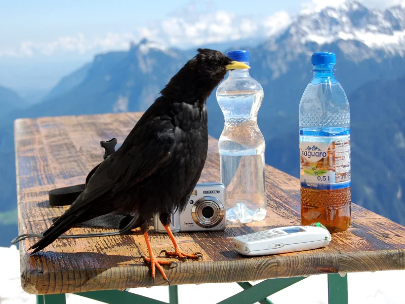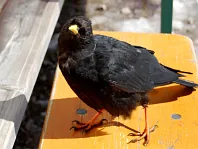 Kavče žlutozobé je odvážný a drzý pták. Bere, na co přijde