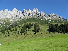 panorama Dachsteinu v protisvětle a opouštíme krásný Mitterfeldalm. Čeká nás přesun přes Saalfelden am Steinernes