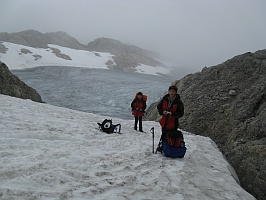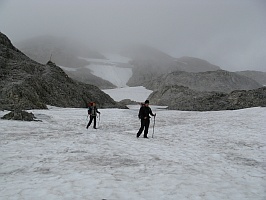 Panoramata žádná, jsme rádi, že alespoň tušíme, kde se nachází patnáct metrů vzdálený Matras Haus, do něhož v zápětí s úlevou vstupujeme. Hybaj do sušárny, pohorky dolů a převlečení vstupujeme do Gaststube. Celkový počet hostů 8 odpovídá panujícímu nečasu, na večeři už nikdo další nepřijde. Veselá Vídeňačka nás okamžitě zve k posezení přímo u rozehřátých kachlových kamen. Volná místa kolem kamen rychle zaplňujeme mokrým oblečením a dáváme si polévku na zahřátí. Následuje ubytování, hra v karty, popíjení zakoupeného čaje s doneseným rumem. Od partnera veselé Vídeňačky máme před sebou náhle po panáku Obstlera. Nechápeme. Dostali všichni hosté chaty, jestli to budeme po hospodsku točit, zřídíme sebe i peněženky. Happy Birthday vše objasňuje a jdeme připít oslavenci. Jeho finanční situace měla štěstí, že si k narozeninám nevybral včerejšek se 110 lidmi na palubě Matras Hausu. U okna v sušárně zakládáme telefonní stanici (oplechování chaty dokonale stíní signál) a následuje úspěšný pokus o navázání SMS kontaktu s našimi mitterfeldalmskými. V deset večer zjišťuji, že venku sněží a jdeme spát. V noci nás budí ledové střešní lavinky. Ráno získáváme zaručenou informaci z druhé ruky, že v 10:05 se zlepší počasí. Dáváme si čaj a platíme s průkazem OeAV v ruce 10,20 Euro za nocleh v Matratzenlageru. Částečné modro máme jen nad sebou, výhledů se nedočkáme. Noční sníh se na štěstí neudržel, můžeme tedy dolů. Sestup jde rychle, hodinku nad Mitterfeldalmem si dopřáváme kávový dýchánek zpestřený mrholením a kolem běžícím nájemcem Matras Hausu. Situace se mění v náš prospěch - Adam má zdravou barvu a počasí se radikálně lepší. Plánovaný přesun na Riemannhaus však nelze do večera stihnout. Odložíme tedy aktivity ve Steinernes Meer