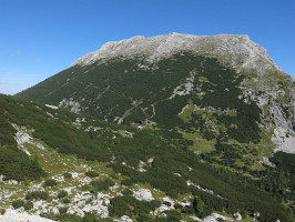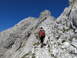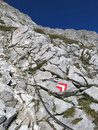 O půl deváté zahajujeme výstup. Klečí a kolem pastvin kamzíků stoupáme k suťovému svahu. Po jeho absolvování následuje pestré skalní lezení cesty Josefinensteig