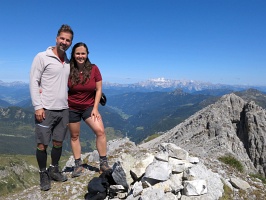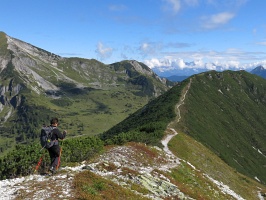 A taky že ano. V 8:30 vyrážíme do stinného terénu. Stoupání mírné, výškové metry přibývají jako nic. Výhledy se stupňují a dosahujeme rozcestí Hengst. Posezení po hodinovém výstupu láká, vrcholy však samy dolů nesestoupí. Suťové rozcestí Gr. / Kl. Pleissingkeil nás posílá vlevo. Beznadějný terén se mění v chodecký. Předbíhá nás běžící malý kluk, na hřebeni se setkáváme s turistickou samotářkou. Hřebenový předvrchol máme v kapse.