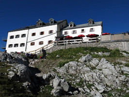 do Ramseider Scharte se konečně ukáže Riemannhaus. V 17:25 jsme na spodní terase chaty. Na horních terasách lidí jako mravenců.