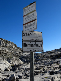 Ráno Teewasser, snídaně a v 8:40 vyrážíme na Schönfeldspitze. Volíme přímý výstup. Slunce sice svítí, ne však na nás. Chodník kolem "Kamenného moře" i výstup k západnímu sedélku Schönfeldspitze zastiňuje masiv Wurmkopfu.