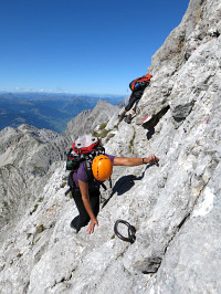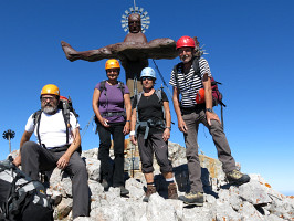 v přilbách a samotář ve slamáku. Počasí skvělé, výhledy fantastické. Nedáváme si obvyklou "vrcholovku", asi nám vrtá hlavou nesnadný sestup. Raději neotupovat pozornost, bude se hodit