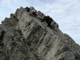 Úvodní, téměř vodorovný hřeben, se po chvíli mění v zajištěné výšvihy a následné ztráty výšky. Přichází zajímavé pasáže exponovaných skalních ploten bez členitosti. Krásné lezení na tření, perfektně zajištěné.