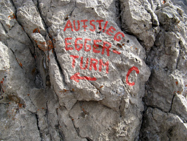 Za věží Eggerturm končí zajištěné pasáže a následuje snadné lezení k vrcholovému kříži. Zánovnímu, blyštivému, oblému, hranatému, neskromnému. Máte za sebou 2,5 hodiny zajímavého výstupu. Sestup nepřináší žádné obtíže, jiná cesta než ta přesně zpátky, vás k chatě nepřivede. Případná zkratka slaněním jezerní stěnou rovnou k chatě vám nabídne 550 výškových metrů.
