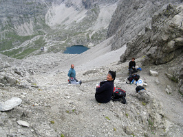 začínáme stoupat ovčí stezkou a snadnou sutí. Raději zavčasu, hrozí zhoršení počasí. Míříme rovnou za nosem do sedla Ödkarscharte. Zde jsme za padesát minut. Následuje navlékání sedáků a nasazování přileb.