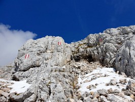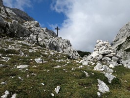 Pokračujeme v sestupu. V Klinserscharte nahlížíme do roklinky plné kovových předmětů. Jde o "Schrott vom Flugzeugabsturz der JU52". Na kříži