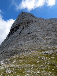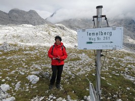 My, zájemci o Temlberg, postupujeme vytrvale terénem místy bludištního charakteru, naštěstí dobře značeným. Pod sedlem potkáváme německy zdravícího svižného mladíka, ze kterého se večer na terase Prielschutzhausu vyklube "Jéňa z Mělníka". Temlbergsattel dosahujeme ve 13:25. Masiv Temlbergu se střídavě halí do mraků a pofukuje studený vítr. Zbývající půlhodina na vrchol Temlbergu