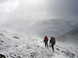 obsah batohů na dva až tři dny a přidáváme sedací úvazky, karabiny, mačky, cepíny a lano. Máme v úmyslu prohlédnout si z blízka